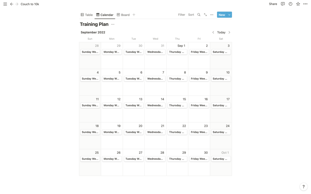 This Notion template contains a comprehensive training plan with tabs to track what you have done, automatic speed and pace calculators and a calendar view so you can schedule your training.
